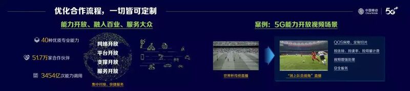生态合作的能力也是企业的核心竞争力和生产力。下阶段,我们将进一步优化合作机制,将专业公司打造为生态合作的推动者、建设者,比如将我们的咪咕公司打造为内容领域的聚合者。同时,将进一步加大网络能力、平台能力、支撑能力、服务能力的开放力度,一切皆可定制,通过全网集中对接的机制与流程,更好地服务合作伙伴。以视频能力定制为例,在世界杯这样的大型赛事直播中,通过中国移动提供的5G网络切片、QoS保障和边缘计算等能力,可为用户提供多视角、高清晰、全场景的观赛体验,实现 “用场上球员的视角看比赛”。同时,向合作伙伴提供按连接、按速率、按用量计费的商务模式,满足商业变现需求。
