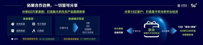 我们分享“移动+家庭”共计13亿规模的客户,以积分为载体,打造平台经济。目前,中国移动存量客户的积分价值超200亿元,有积分的客户超6亿,后续将进一步加大积分向生态的开放力度,客户可通过积分兑换合作伙伴的商品和权益,产生规模价值,形成平台经济。
