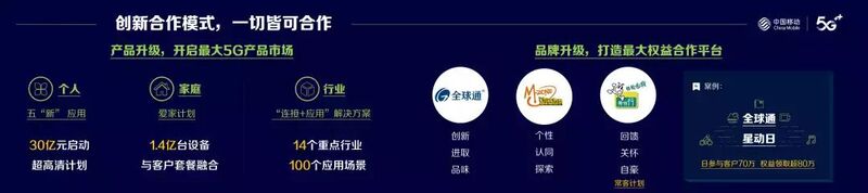一方面,升级产品合作,开启最大5G产品市场。面向个人客户,打造基于5G的“新玩法、新拍法、新看法、新听法、新用法”。中国移动将投入专项的业务发展基金,其中包括30亿元5G+超高清视频启动资金。面向家庭客户,推出“爱家计划”,打造“全网智联”、“全屋智能”、“全家智享”的一体化智慧家庭产品体系,将包括智能网关、魔百盒、智能终端在内的1.4亿台设备与客户套餐融合。面向行业客户,在14个重点行业联合合作伙伴共同打造 100个“连接+应用”的业务场景。
