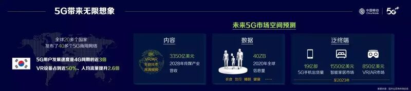 另一方面,5G带来无限想象,也需要大家共同开拓。目前,全球有20多个国家发布了40多个5G网络。从韩国的经验来看,5G商用仅半年,用户数就超过了500万,是4G同期的近3倍;5G 的人均流量达到24GB,是4G用户的2.6倍;用户使用的5G终端中VR设备占到近50%。和4G时代相比,5G将推动内容、数据和终端等领域的全面升级。在内容领域,超视频时代将来临,预计未来十年,5G将为传媒产业带来3350亿美元的营收。在数据领域,2020年全球新建和复制的信息量将超过40ZB,用户数据肖像将全方位更立体,数据将比我们更懂客户。在泛终端领域,未来五年全球5G手机出货量将达到19亿部,智能家居市场规模达到1550亿美元,VR/AR设备规模达到约850亿美元。