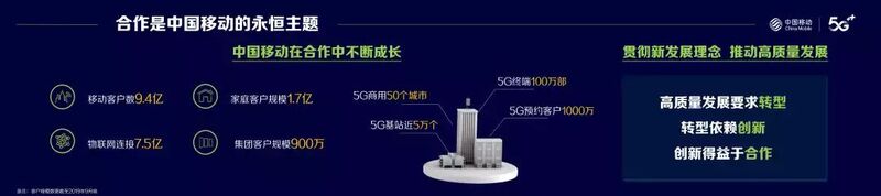 合作推动了中国移动的不断成长。近20年来,在产业合作伙伴的帮助下,中国移动成长为全球规模最大的通信运营商,移动客户9.4亿,家庭客户1.7亿,集团客户900万,物联网连接7.5亿户。同时,作为5G建设的主力军,在5G发展中实现了领跑,已建成5G基站近5万个,实现了50个城市商用,销售了百万部5G终端,5G预约客户数超1000万。当前,中国移动正处于转型升级的关键时期。深入贯彻新发展理念,推动高质量发展,一方面,需要加快推动业务的供给侧改革,从4G时代的流量经营向5G时代的业务和应用经营转型,转型需要创新,创新离不开生态合作。另一方面,中国移动在构建“力量大厦”的过程中,做网络强国、数字中国、智慧社会的主力军,也需要持续深化对外合作,打造良好的生态环境。