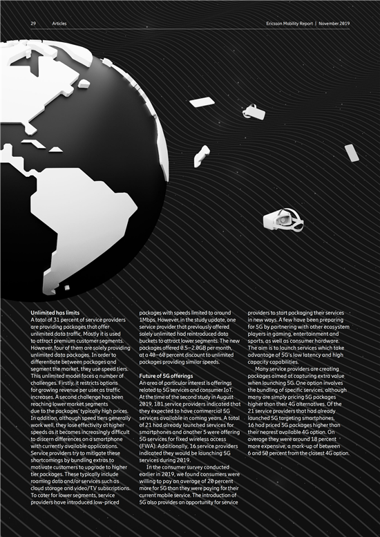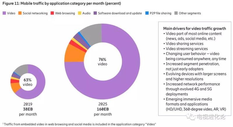 5G技术推动视频数据消耗量持续增长。2019年11月,爱立信发布的移动报告《Ericsson Mobility Report November 2019》显示,移动视频数据正以年30%的速度递增,2025年,视频数据在移动数据量中占比将从60%增加到76%”。