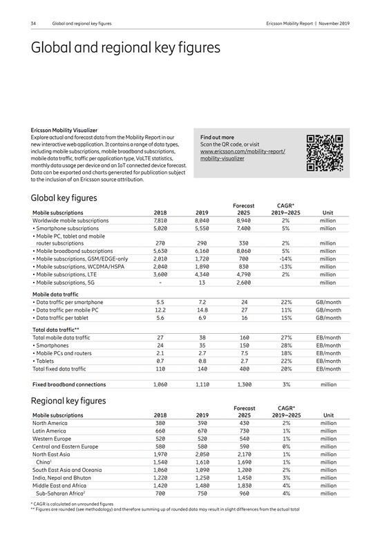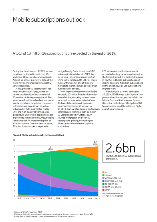 报告预测,2025年5G网络将覆盖全球六成以上的人口。届时,移动视频消费将随时、随地进行,移动设备的屏幕更大,并支持更高清晰度。在5G支持下,超高清、AR、VR等应用将广泛应用于移动设备。到2025年,5G网络将覆盖全球六成以上的人口。