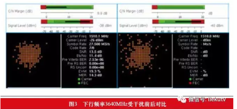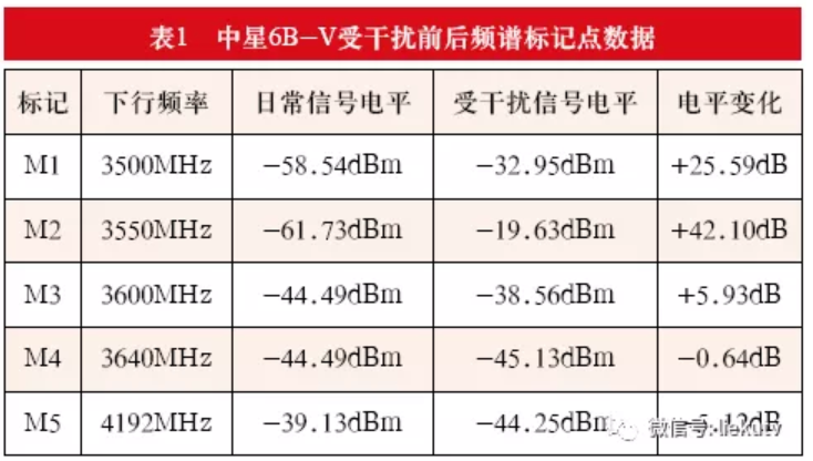 5. 图1的M3标识处为频宽40MHz,中心频率为3600MHz的卫星载波,与3600MHz的5G频率完全重合。此时无法通过滤波方法解决干扰问题,只能通过加装屏蔽网、收窄5G信号带宽到60MHz或者降低功率、调整方向角等方法尝试解决。