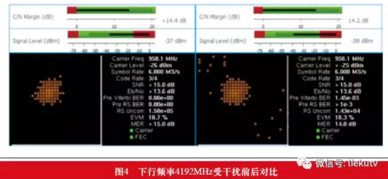 如图4所示:信号正常时,4192MHz信号的QPSK星座图较为集中,Eb>13.6dB,误码率为0.00E-0;在受到干扰时,QPSK星座图较为分散,Eb>13.6dB,维特比译码输出误码率为1.45E-3。两者对比,受干扰前后,Eb值都大于门限值,但受干扰时的误码率大于2.0E-4。