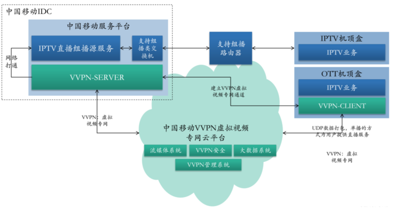 而VVPN基于SDN/NFV技术,在不改造网络设备的前提下,利用互联网架设虚拟专网在播放终端与后台间建立VVPN局域网通道,从而低成本、快速的实现了OTT向IPTV的转化。同时,VVPN解决了UDP组播传输直播这个难题。