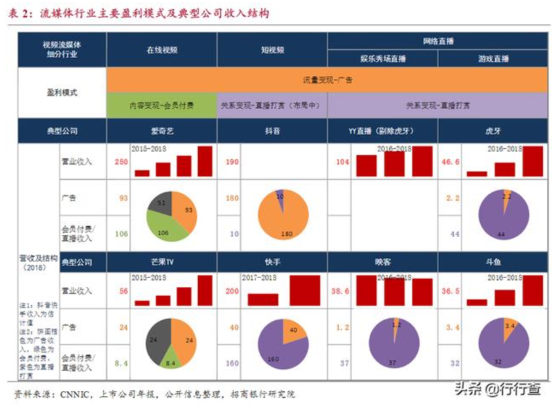 考虑到5G等信息技术的持续发展,视频流媒体仍处于成长期。从细分行业来看,在线视频和网络直播相比短视频行业的发展更为成熟。当前,在线视频和网络直播已有较为成熟的变现模式,处于龙头公司做产业链深耕或拓展加固流量生态圈的阶段。短视频行业处于变现初期,多类商业模式正在探索。