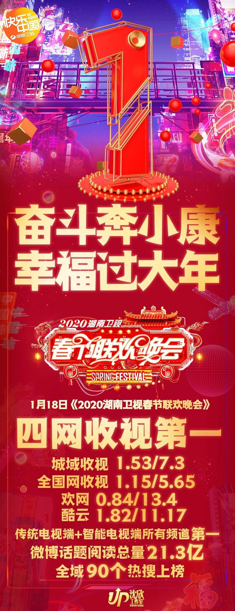 晚会以“奋斗奔小康 幸福过大年”为主题,舞美延续中国风设计,内容丰富,形式多元,满载正能量,洋溢着青春活力。不少观众、网友称赞晚会“又惊喜又感动又有意义”。超高关注度,离不开台、集团公司领导吕焕斌、张华立、罗伟雄、杨壮、冯锦、朱皓峰的现场指导,离不开众多明星卡司的强力加持,也离不开“晚会金牌之师”湖南卫视沈欣工作室的辛劳奉献。