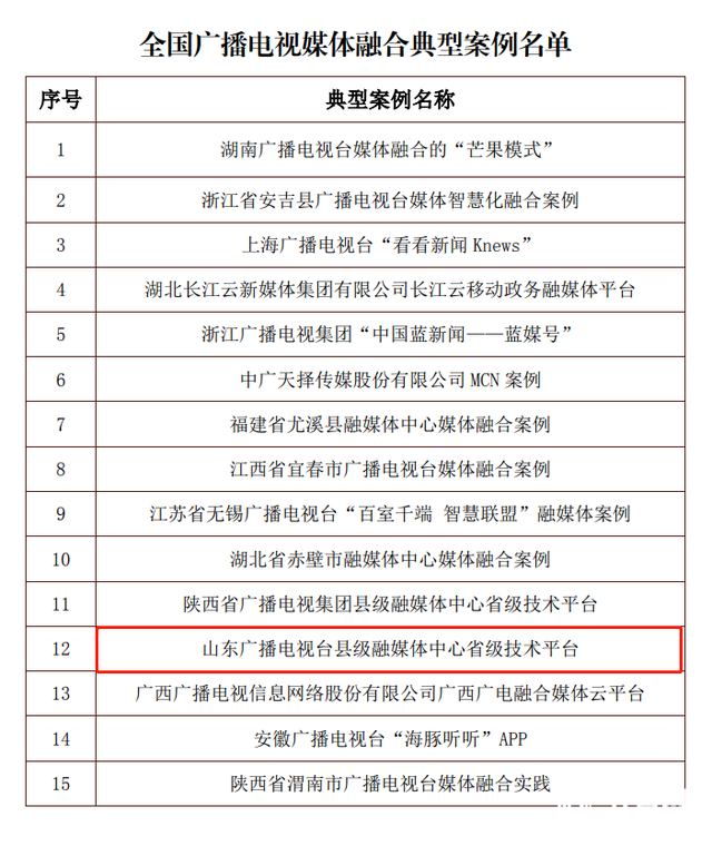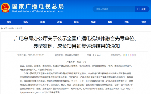 1月17日,国家广播电视总局发布了《广电总局办公厅关于公示全国广播电视媒体融合先导单位、典型案例、成长项目征集评选结果的通知》,对10家全国广播电视媒体融合先导单位、15个全国广播电视媒体融合典型案例、14个全国广播电视媒体融合成长项目的名单进行了公示。