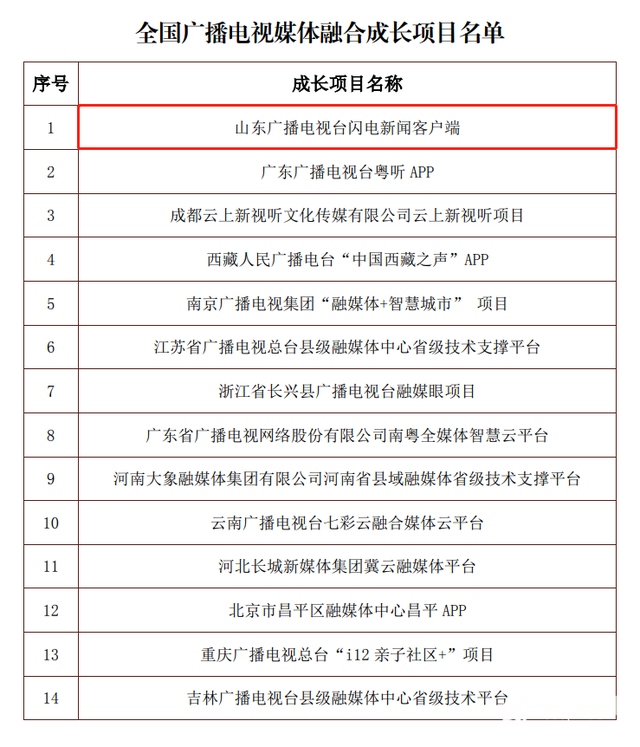 山东广播电视台闪电新闻客户端、广东广播电视台粤听APP等14个项目被评为“全国广播电视媒体融合成长项目”。