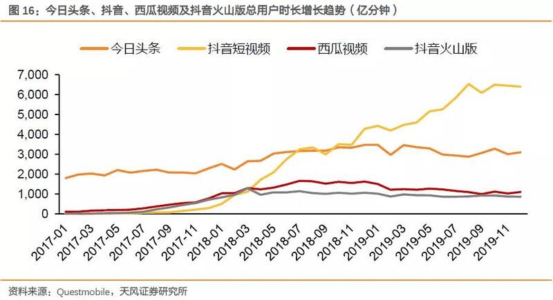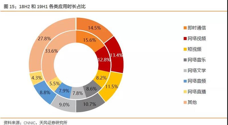 长视频为用户使用时长占比仅次于即时通信的娱乐形式,字节跳动切入长视频领域有利于其产品总用户时长进一步增长。根据CNNIC数据,2019年上半年在线视频类APP用户使用时长占比环比扩大0.6pct至13.4%,占比仅次于即时通信,且差距缩小。