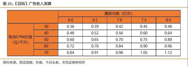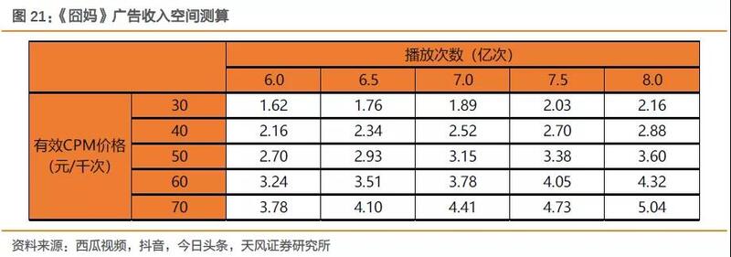 以大年初一免费播出的《囧妈》为例,根据凤凰网报道,截止1月27日《囧妈》在头条系四大平台(抖音、西瓜视频、今日头条、抖音火山版)及智能电视鲜时光总播放量超过6亿,《囧妈》片头仅两段15秒海澜之家贴片广告和字节跳动公益广告,另外用户打开APP时有一段开屏广告,假设平均CPM价格为50元/千次,总计播放次数7亿次,每个用户浏览2条广告(开屏广告和贴片广告),则《囧妈》广告收入仅7000万元。就算考虑后续持续播放量,广告收入体量也在1-2亿水平。