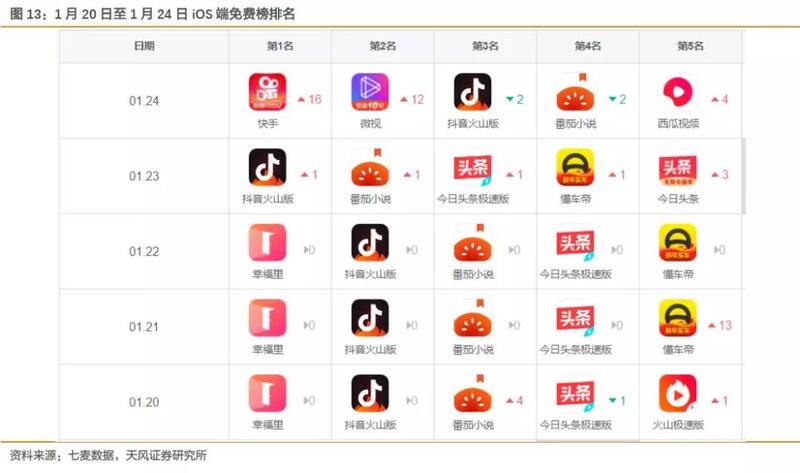 快手红包方案为从1月24日晚8点到次日凌晨共计发放10亿现金红包(实际预算可能更高)。春晚红包确实为快手直接带来了下载量的增长,根据七麦数据,快手APP 1月24日免费榜排名上升16名,超过头条系、微视等一众竞争对手位列第一。