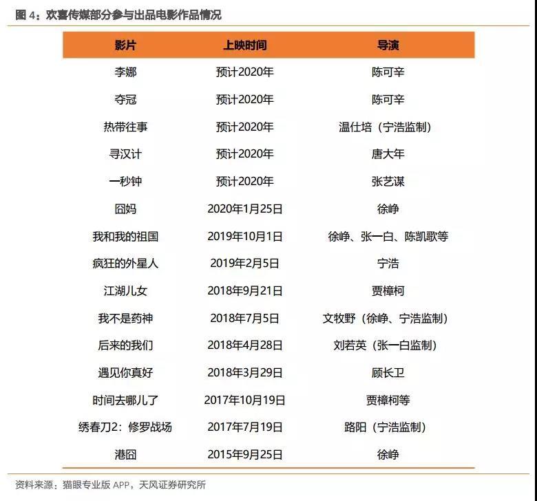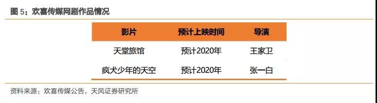 欢喜传媒电影/电视剧产量较小同时难以负担较大体量的内容支出,因而欢喜首映平台影响力并不突出。2015年至今欢喜传媒上映电影作品约10部(包括《囧妈》)。2020年开始公司影视剧作品上线预计加速,当前储备电影项目包括张艺谋导演《一秒钟》、陈可辛导演《李娜》《夺冠》等5部,网剧作品包括王家卫导演《天堂旅馆》、张一白导演《疯犬少年的天空》等。