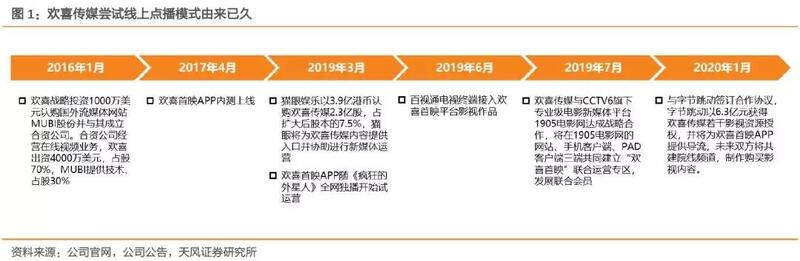 欢喜传媒自建欢喜首映平台,尝试线上点播模式由来已久。欢喜传媒2016年战略投资1000万美元认购国外流媒体网站MUBI股份并成立合资公司经营在线视频业务,MUBI为创立于土耳其的在线电影网站,主打独立电影的视频点播服务,有独立电影界Netflix之称。2017年欢喜首映APP内测上线,2019年3月,猫眼娱乐与欢喜传媒达成合作,猫眼为欢喜传媒内容提供入口并协助其新媒体运营,同月欢喜首映APP随《疯狂的外星人》全网独播开始试运营,随后欢喜首映陆续和百视通、CCTV6旗下专业级电影新媒体平台1905电影网达成战略合作。