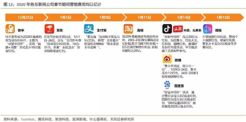 2020年春节前各互联网公司先后发布红包方案,其中快手(10亿红包)和淘宝成为春晚独家互动合作伙伴和独家电商合作伙伴,另外,京东、支付宝、头条系、百度系、微视等也有相应的红包玩法,红包总金额均以亿计。