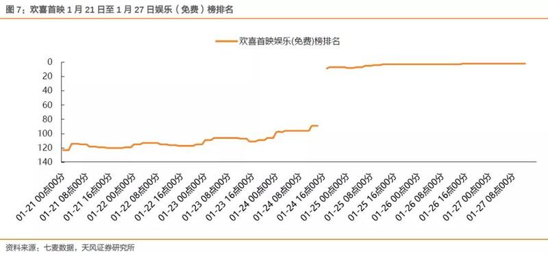其次,据欢喜传媒2019年中报披露数据,欢喜首映付费用户数超过100万,相比各大视频网站付费用户数而言差距较大。而通过此次事件的推动,欢喜首映APP下载量明显提升,1月24日前欢喜首映APP在娱乐(免费)榜中维持在100名后,1月25日迅速冲进榜单前3。