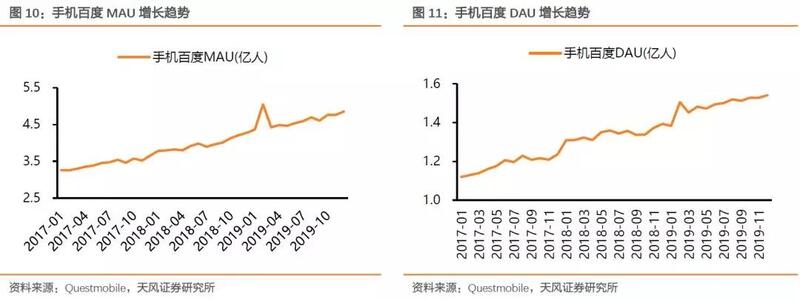 2019年百度作为央视《春节联欢晚会》独家网络互动平台,参与2019年的春晚红包互动,活动期间为1月28日(小年)至2月4日(除夕),共8天,红包总额高达10亿。10亿红包直接拉动百度用户数据增长,百度2019年2月MUA和DAU分别相对1月增长6800万和1200万至5.05亿和1.51亿,而2018年全年百度MAU和DAU净增量也仅6200万和1600万。