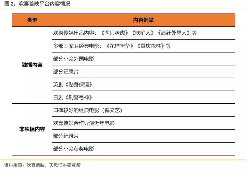 欢喜首映平台内容分为独家内容和非独家内容两类。独家内容主要是欢喜传媒主出品或合作导演拍摄电影,如《疯狂的外星人》、王家卫经典电影《花样年华》等,另外有部分外采内容,包括部分小众外国电影、纪录片,以及英剧《贴身保镖》和日剧《刑警弓神》等。非独播内容则为部分欢喜传媒合作导演近年电影作品及外购的经典电影等。
