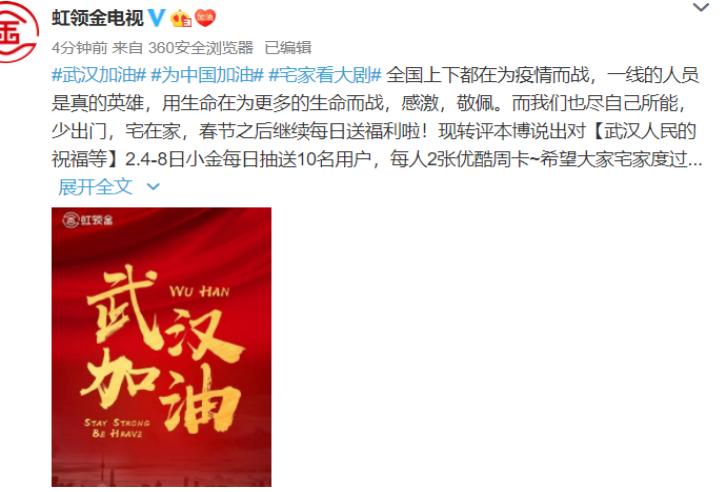 为了让民众更少出门,留更多时间在家,长虹电视虹领金系统还从春节开始,通过虹领金电视端会员中心、微信公众号、微博等平台,为大家免费发放优酷超级会员卡,联合优酷推送《乡村爱情12》等一批热剧。而虹领金系统的藏金阁也加大超级会员卡的投放,让尽可能多的用户获得会员卡。
