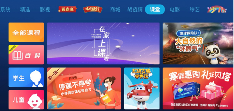 【流媒体网】消息:积极响应国家“停课不停学”、“停课不停教”的指导要求,长虹利用智能电视大屏的优势,通过旗下虹魔方公司运营的虹领金系统,协同腾讯、爱奇艺、优酷等互联网企业及专注于教育内容资源开发制作的公司,向长虹智能电视用户提供多样、海量、优质教育内容,让全国的各级学生们在家就能上课。