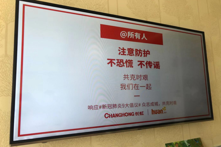 众所周知,电视是家庭里重要的应用设备,尤其是智能电视的普及,电视能够满足用户更多的需求,日益成为家庭的重要媒介。春运开始,长虹智能电视的虹领金系统在电视开机视频等多个重点位置播放央视新闻特别策划制作新型肺炎防范宣传片;尤其是利用屏保功能,长虹、欢网联合制作投放了防疫的公益广告,受到了广大用户的好评,并引发用户自发口碑传播。