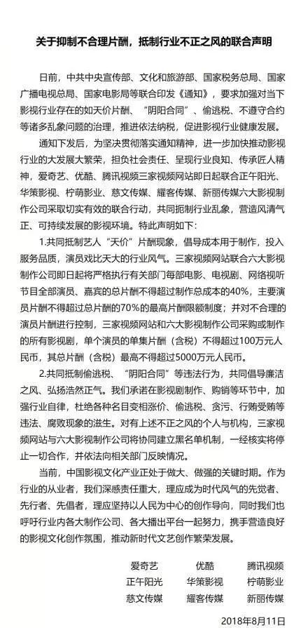 在作为主要内容成本来源的明星薪酬上,作为利益攸关方,平台开始整合和展现自己的权力。2018年4月起,三家长视频先后三次发表联合声明,要求规范影视行业秩序,伴随着“阴阳合同”和影视行业税率整改事件的发酵,联合声明中对明星薪资和行为规范的限制也越来越明确。