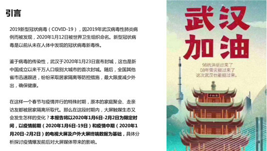 【流媒体网】摘要:本报告将以2020年1月6日—2月2日为限定时间,以疫情期间(2020年1月6日—19日)和疫情中期(2020年1月20日—2月2日)的电视大屏及户外大屏终端数据为基础,具体分析探讨疫情爆发前后对大屏媒体带来的影响。