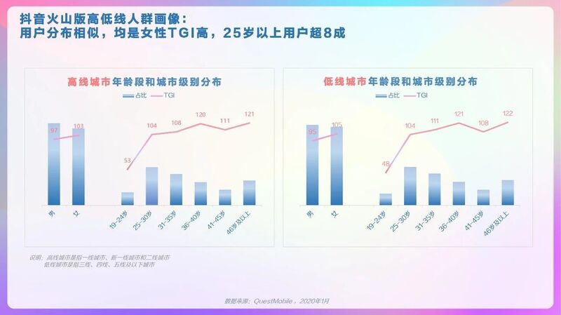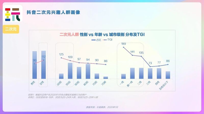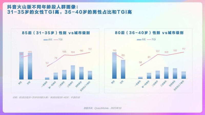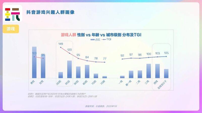 抖音整体人群画像,男女较均衡,19-30岁TGI高,新一线、三线及以下城市用户TGI高。抖音省份/城市TOP10分布,广东、河南、山东省占比高,郑州、西安、昆明市偏好度高。抖音男女人群画像,男性19-24岁、41-45岁的用户偏好度高,女性中19-30岁用户偏好度高。抖音高低线城市人群画像,高线城市中19-30岁的用户偏好度高,低线城市中19-35岁用户偏好度高。抖音不同年龄段人群画像,95后中男性占比略高、且TGI高;90后中女性TGI高。抖音不同年龄段人群画像,85后中女性TGI高,低线城市占比超6成;80后中男性占比高、TGI高。