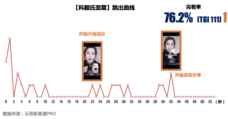 从用户行为来看,【科颜氏面霜】创意吸睛度较高,视频完看率76.2%,高于同类视频均值(TGI 111)。受众流失主要出现在达人开始介绍产品成分以及开始亲测分享两个环节。