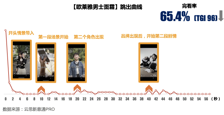 从用户行为来看,【欧莱雅男士面霜】创意吸睛度较低,视频完看率65.4%,低于同类视频均值(TGI 96)。受众流失主要出现在开头情景代入、第一段场景开始、第二个角色出现以及品牌出现后开始第二段剧情等四个环节,尤其在开头情景带入时流失率最高。