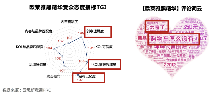 从用户态度来看,【黑精华】创意的【品牌记忆度】【KOL推荐兴趣度】【创意理解度】表现优于同类创意,此次创意内容信息传递清晰,KOL成功激发用户兴趣,且用户对品牌记忆度有较高提升。从评论来看,用户购物倾向较强,但 [购物路径] 体验仍有优化空间。