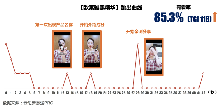 从用户行为来看,【黑精华】创意吸睛度高,视频完看率85.3%,高于同类视频均值(TGI 118)。受众流失主要出现在第一次出现产品名称,达人开始介绍产品成分,以及开始亲测分享的三个环节。