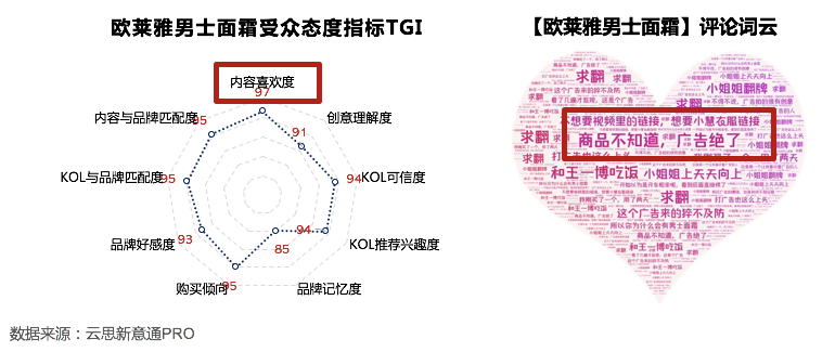 从用户态度来看,【欧莱雅男士面霜】创意的9项态度指标均低于同类表现,就自身创意而言,【内容喜欢度】比其他体验结果略优。评论内容体现出此创意明显的优劣势,创意采用“剧情+”模式,尽管带入感强,但KOL定位与品牌有差异,信息传递度较低。