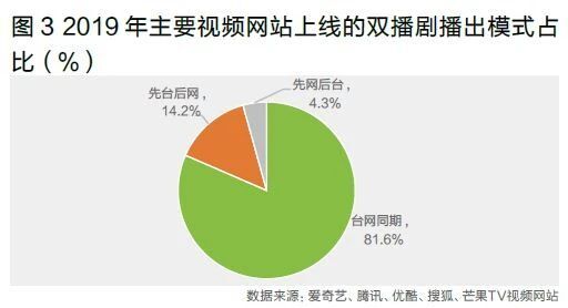 2019年五家视频网站上新的双播剧,基本上采用台网同期[8]、先台后网[9]、先网后台[10]三种播出模式。台网同期的双播剧占比为81.6%,先台后网的双播剧占比仅为14.2%(图3)。