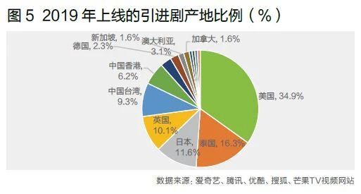 2019年主要视频网站上新的引进剧中,美剧的体量最大,以34.9%的比例遥遥领先。泰剧、日剧、英剧的数量占比在10.0%-16.5%之间。