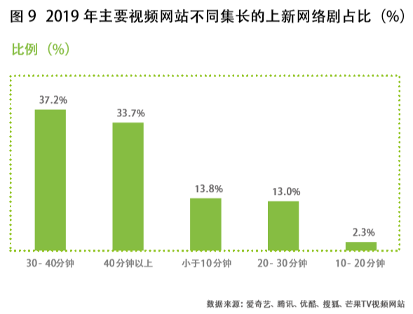 2019年主要视频网站上新的网络剧中,平均集长超过30分钟的剧目占比最大,其中集长在30-40分钟的剧目所占份额为37.2%,集长超过40分钟的剧目份额为33.7%。此外,集长小于10分钟的剧目也超过了一成的比例(图9)。