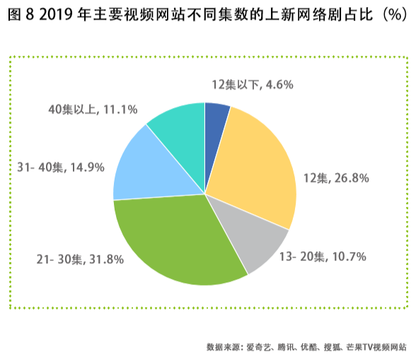 2019年上新的网络剧中,40集以上的长篇幅剧目所占比例相对较小,12集的短篇幅剧目(26.8%)和21-30集的中等篇幅剧目(31.8%)合计占据了半数以上份额(图8)。