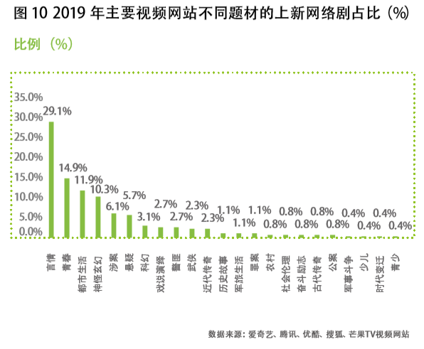 2019年主要视频网站的新剧,题材共有23类,可谓种类繁多。但剧目题材的集中性也较高,言情剧比例达到29.1%,数量居首。青春、都市生活、神怪玄幻题材占比也均在10%以上,涉案剧、悬疑剧也占有一定的比例(图10)。