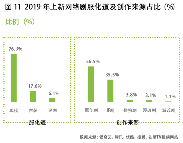 2019年主要视频网站的上新网络剧仍以现代剧为主,但古装、民国剧也占据了一定的比例。