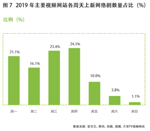 观察不同周天网络新剧的上线情况,视频网站更倾向于在工作日推出新剧, 周末上新比例较低。周四、周三、周一是网络剧上新最为集中的周天,其中周四占比最高(图7)。