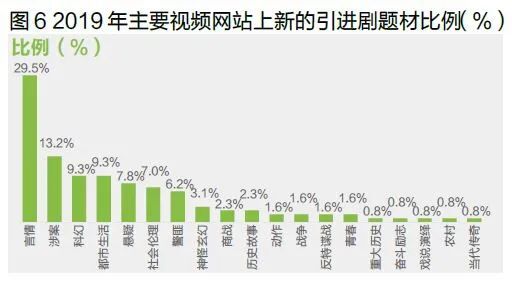 言情剧在2019年主要视频网站的上新引进剧中比例最高,其次为涉案剧。科幻、都市生活、悬疑、社会伦理、警匪题材也占据一定比例,其余题材的剧目占比则较低(图6)。这些引进剧目的时代背景多聚焦于当代,当代题材剧占比达到85.3%。