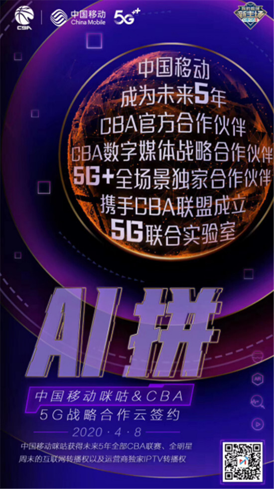 在中国移动咪咕公司与CBA联盟举行的主题为“AI 拼”的5G战略合作“云”签约仪式上,中国移动成为未来5年CBA官方合作伙伴,旗下咪咕公司成为未来5年CBA数字媒体战略合作伙伴、5G+全场景独家合作伙伴,获得未来5年全部CBA联赛、全明星周末的互联网转播权以及运营商独家IPTV转播权。同时,双方围绕5G进行战略合作升级,将成立5G联合实验室,助力中国职业篮球迈入5G时代。