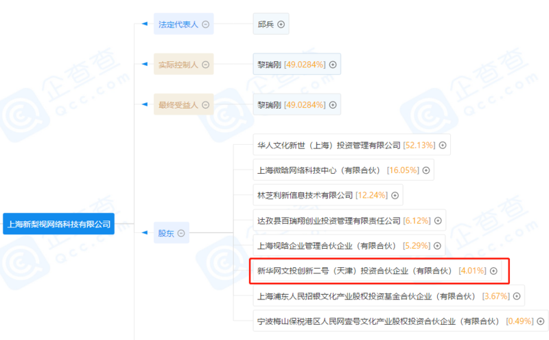 据传媒内参查询企查查数据显示,目前梨视频经历四轮融资,此番入股的新华网文投创新二号持股4.01%为第六大股东,大股东为华人文化占股52.13%,第三大股东为腾讯(林芝创新信息技术有限公司)占股12.24%,第二大股东是邱兵控股的上海逸晗网络科技有限公司,占股16.05%。