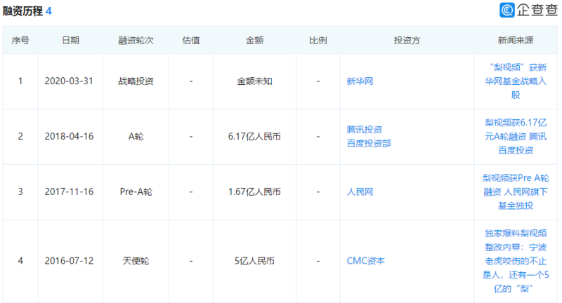 4月8日,据新榜消息,继华人文化、人民网、腾讯、百度之后,新华网进入梨视频股东阵容,梨视频由此迎来人民网之外的又一国家队。