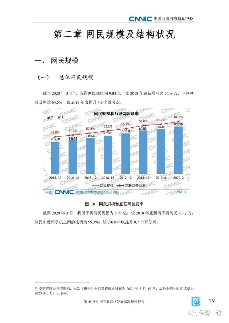 截至2020年3月,我国网民规模达9.04亿,较2018年底增长7508万,互联网普及率达64.5%,较2018年底提升4.9个百分点。