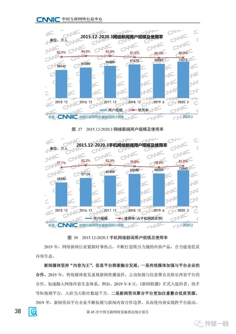 截至2020年3月,我国网络新闻用户规模达7.31亿,较2018年底增长5598万,占网民整体的80.9%;手机网络新闻用户规模达7.26亿,较2018年底增长7356万,占手机网民的81.0%。