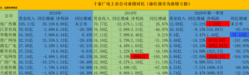从营业额和利润收入来看,在2020年第一季度,广电10家上市公司中有8家营收收入同比下滑,10家净利润同比全部下跌,4家甚至出现了亏损。