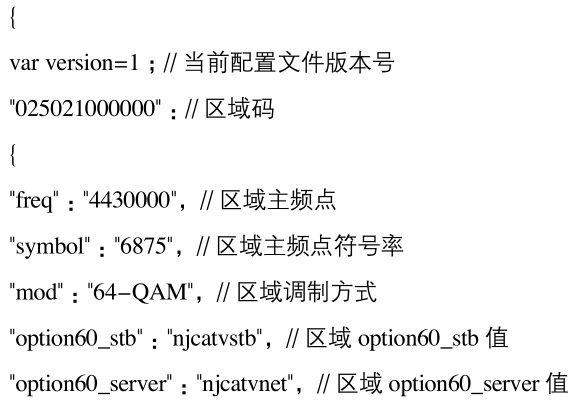 由于江苏有线全省区域众多,不同区域业务存在一定的差异性,针对江苏有全省统一软件区域配置,TVOS-H单引擎操作系统软件在电视UI中预先内置一个区域配置文件(该文件主要描述江苏有线全省各区域区域码以及其对应的相关特定区域配置项)。机顶盒终端软件在发布前通过系统软件中key分区文件配置版本发布区域对应的区域码。之后机顶盒终端即可根据key分区中的区域码,从区域配置文件中获取终端所在当前区域的相关配置信息。从而实现全省统一软件版本区域控制。