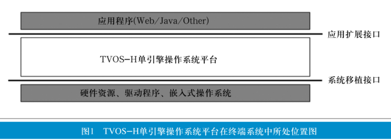 TVOS-H系统软件是位于终端硬件驱动和嵌入式操作系统层之上、应用软件层之下的软件系统。它对下层可以屏蔽不同硬件平台和操作系统的差异,使同一个应用能在不同的终端上运行;对上层可以提供丰富的程序开发接口,使同一款终端能支持各种各样的数字电视应用,图1描述了TVOS-H单引擎操作系统在终端所处的位置。